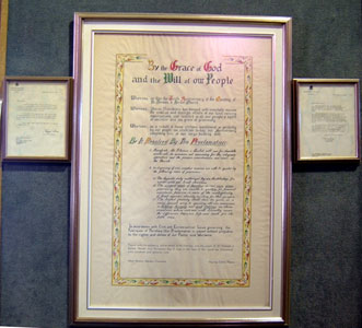 an award he was given to honor his caring for children; a large framed scroll of the original 1979 Parish Proclamation; a letter from the Vatican acknowledging this 1979 parish commitment; and an official certificate marking the dedication and consecration of the Church & Altar October 13, 1996.