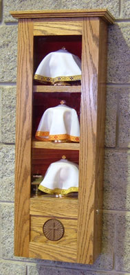The Ambry is the repository for the holy oils blessed by the Archbishop in Holy Week each year at the Chrism Mass. All the priests who can gather around the Archbishop, renew their ordination promises, and then the Archbishop blesses the holy oils for the Catechumens and the Sick. The Catechumens are those who are not yet baptized who are strengthened by this oil to live the Christian life and receive the other sacraments. People can be anointed whenever they become sick or when their illness becomes more serious, or before an operation. The Holy Chrism is not just blessed, it is consecrated, which means it is to be used by God to give a special participation in the holiness and power of God to persons and things. Holy Chrism is used in Baptism to make the newly baptized temples of the holy indwelling of the Blessed Trinity. It is used at Confirmation to fill the confirmand with the Holy Spirit and mark them with the character of Christian, a disciple of Jesus. It is used in Holy Orders to give a new priest - on his hands - the power to act in Jesus' Name to sanctify the people of God and to offer sacrifice to God, and a new bishop - on his head - as a mystical anointing to fill him with blessings for the people of God. The Holy Chrism is used to anoint crosses for the consecration of a church and also of an altar. The five crosses on the altar represent the five wounds of Jesus, and the 4 or 12 crosses in the church are for the 4 evangelists or the 12 apostles. (Ambry, chalices and linen donated by Terry Laporte. Ambry designed and built by Bernie Lavigne.)