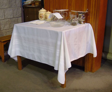 From this table are prepared all the elements needed for the Sacred Liturgy: especially the bread and wine, water, and vessels containing them, and the linens,