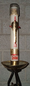 As it burns to give us light, this beautiful beeswax candle slowly gives up its wax, just as Jesus gave up his life to give us the true Light of Love and Eternal Life. So this candle represents Jesus, the Pasch or Passover Lamb, who gives his life to save us. The Chiro (Greek K) looks like "X" and with a "P" (Greek R) over it: in English "Chr", the first letters of CHRIST. The Alpha "A" and Omega "M", the first and last Greek letters, mean Jesus is the Beginning and the End of all Creation and Salvation. The five nails recall Jesus' five wounds.